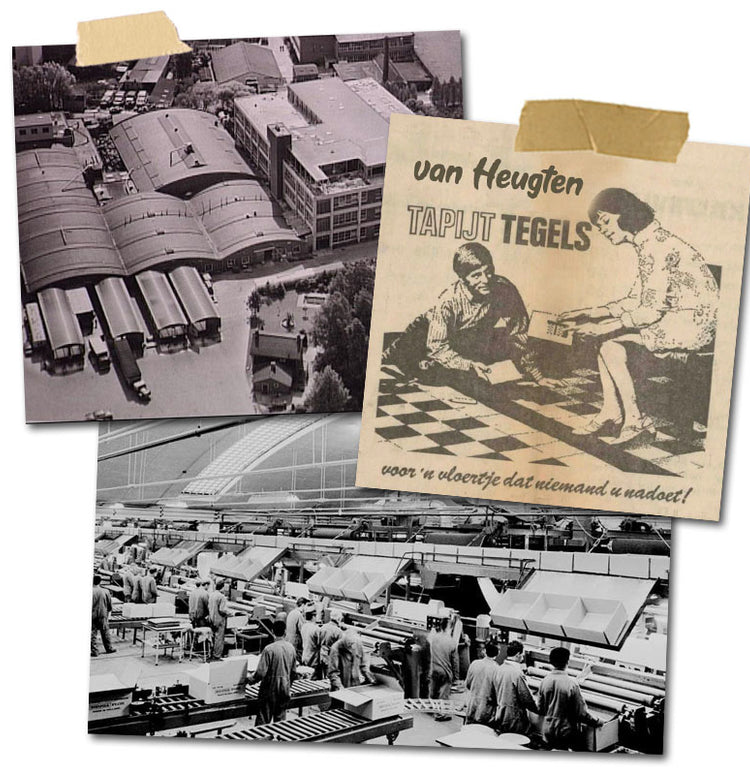De Van Heugten Tapijttegel is in die tijd per toeval ontstaan uit het beperken van de schade die het gevolg was van de 5 jaar garantie welke P.J. van Heugten verstrekte op zijn rollen (150 cm) Heugavilt tapijt.